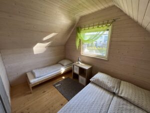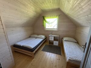 2 sypialnie 3 osobowe (w każdej łóżko podwójne i łóżko pojedyncze), szafy, pościel